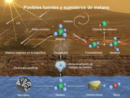 las cuales el metano podría sumarse a la atmósfera de Marte (fuentes) y