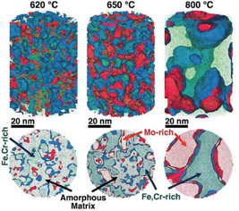 Distribución del cromo (azul) y el molibdeno (rojo) en una aleación con